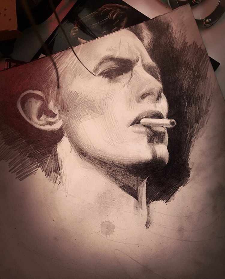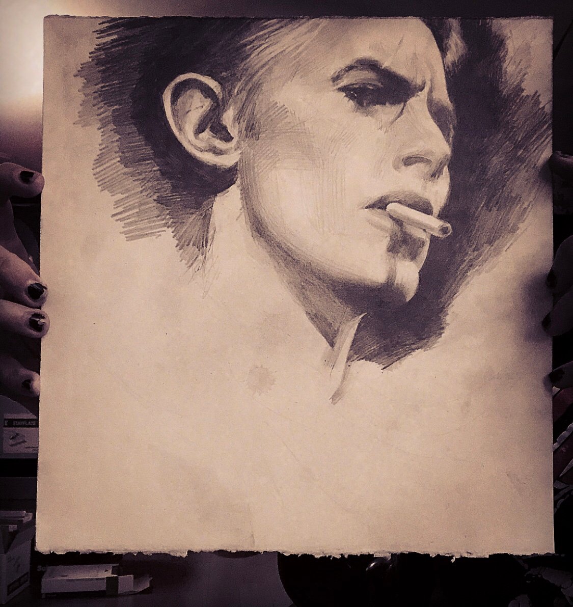 "I drew David Bowie today and signed it with a single, makeup-filled tear in the center of his throat. Rest in Peace, almighty Bowie. The stars shine for you tonight..." -KL 1.11.16
