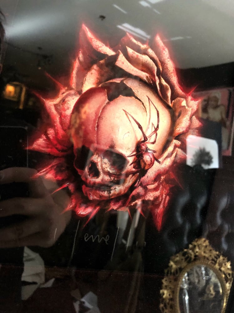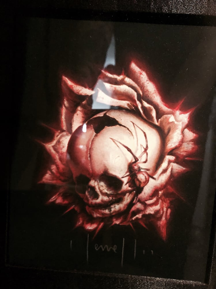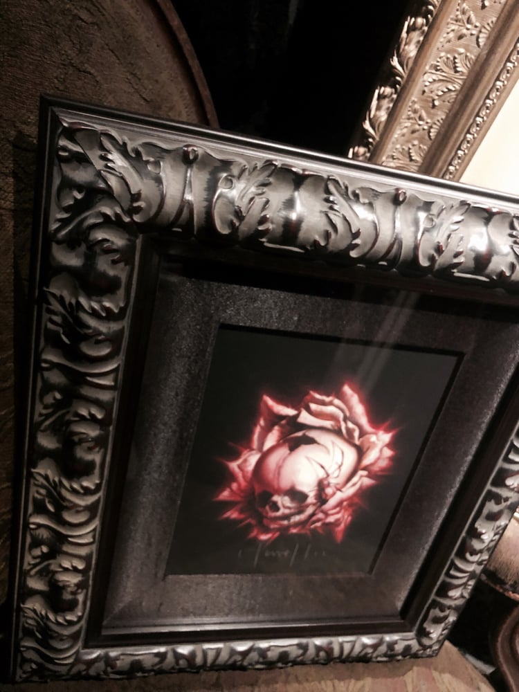 'DIE, DIE, DIE, MY DARLING...' - Signed and framed Museum Archival { Open Edition } Miniature Print. This artwork is framed in a dark grey brown wood frame with metallic highlights and a dark blood red / burgundy linen wrapped mat.