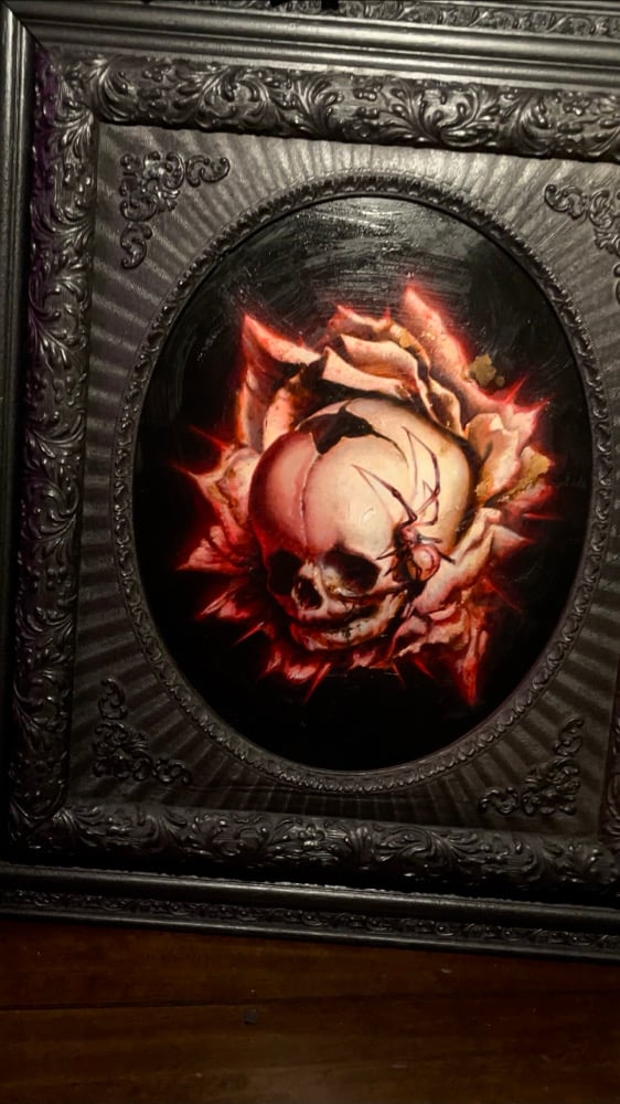 "The rose glows as if lit by its own heartbeat, each petal blushing with that strange red radiance that comes only from something hidden beneath. The skull rests inside it like a kept secret, gently held, gently exposed. Through the petals, a white widow wanders — pale as the bloom itself, except for the red cross on its back, sharp as a whispered omen. It walks with the calm of a creature following a path it’s walked a thousand times, untroubled by the beauty it trespasses." - KL